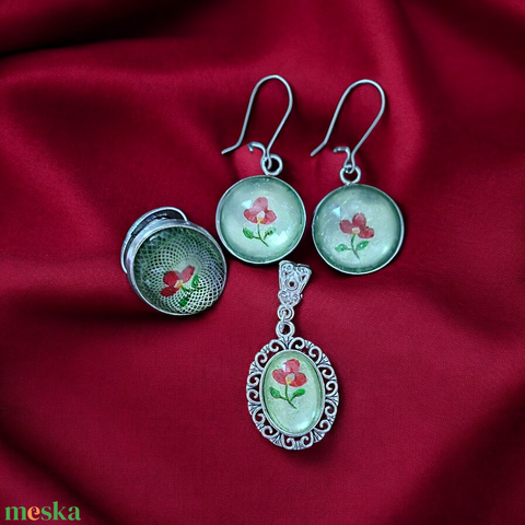 Vintage Stílusú Piros Virágos Zöld Álom Medál Fülbevaló Gyűrű Szett