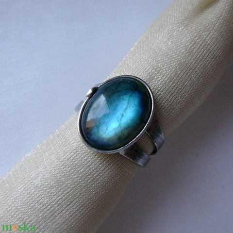 A gyűrű Tiffany technikával készült labradorit csepp és ólommentes, ezüsttartalmú ón felhasználásával. A díszítés szintén saját készítésű, nem tartalmaz gyári elemeket. A fémrészt óezüstre patináztam, lekezeltem antioxidánssal és lelakkoztam, hogy sokáig szép maradjon.