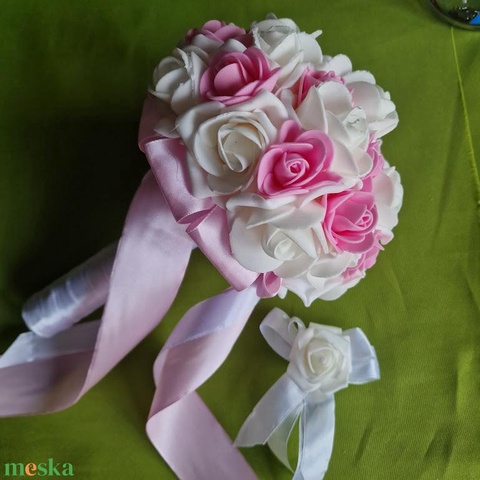 ESKÜVŐ MCS31 - Fehér menyasszonyi habrózsa csokor - rózsaszín