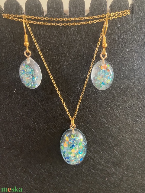 Kék csillogós, pillangós fülbevaló és nyaklánc szett