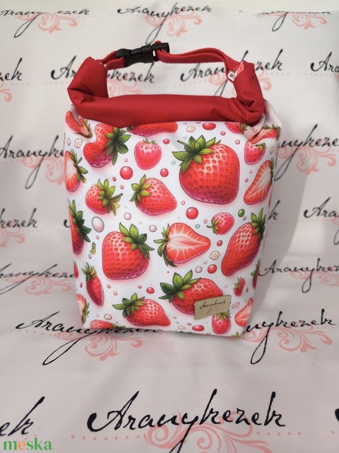 Eper mintás-Vízálló uzsonnás tasak kézben vihető-PUL béléssel-Vállon is viheted egy megvásárolható pánttal