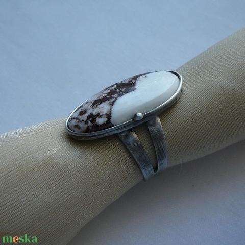 A gyűrű Tiffany technikával készült magnezit és ólommentes, ezüsttartalmú ón felhasználásával. A díszítés szintén saját készítésű, nem tartalmaz gyári elemeket. A fémrészt óezüstre patináztam, lekezeltem antioxidánssal és lelakoztam, hogy sokáig szép maradjon.