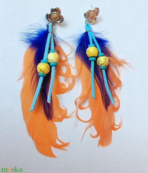 Kék narancs sárga tollas fülbevaló gyöngy függőkkel