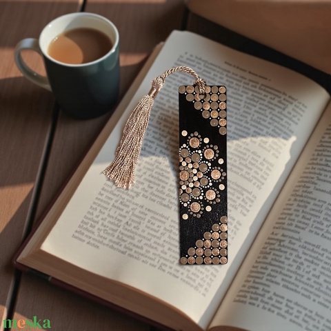 Fa könyvjelző barna, bronz és mokka pontmandala díszítéssel, selymes bojttal, 3,2x12x0,15 cm