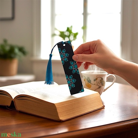 Fa könyvjelző metál fényű acélkék és türkiz pontmandala díszítéssel, selymes bojttal, 3,2x12x0,15 cm
