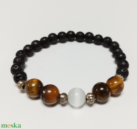 Szelenit, tigrisszem és lávakő ásványgyöngyök felhasználásával készült egyedi karkötő. A tartósság érdekében 4 (!!) sor szilikongumira fűztem fel.