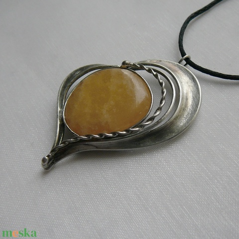 A medál Tiffany technikával készült kalcit kaboson és ólommentes, ezüsttartalmú ón felhasználásával. A díszítés szintén saját készítésű, nem tartalmaz gyári elemeket. A fémrészt óezüstre patináztam és lelakkoztam, hogy sokáig szép maradjon.