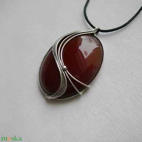 A medál Tiffany technikával készült karneol és ólommentes, ezüsttartalmú ón felhasználásával. A díszítés szintén saját készítésű, nem tartalmaz gyári elemeket. A fémrészt óezűstre patináztam, lekezeltem antioxidánssal és lelakkoztam, hogy sokáig szép maradjon.