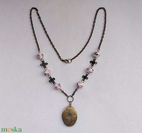 - Anyaga: delfinkapocs, ékszerlánc, porcelángyöngyök, zárható medál