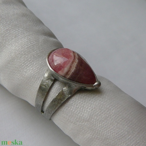 A gyűrű tiffany technikával készült rodokrozit és ólommentes, ezüsttartalmú ón felhasználásával. A díszítés szintén saját készítésű, nem tartalmaz gyári elemeket. A fémrészt óezüstre patináztam, lekezeltem antioxidánssal és lelakkoztam, hogy sokáig szép maradjon.