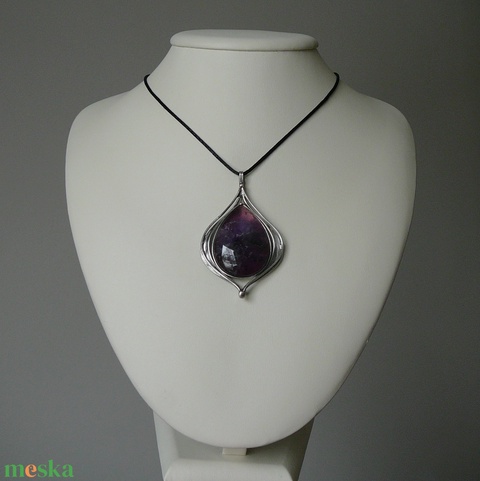A medál Tiffany technikával készült ametiszt és ólommentes, ezüsttartalmú ón felhasználásával. A díszítés szintén saját készítésű, nem tartalmaz gyári elemeket. A fémrészt óezüstre patináztam, lekezeltem antioxidánssal és lelakkoztam, hogy sokáig szép maradjon.