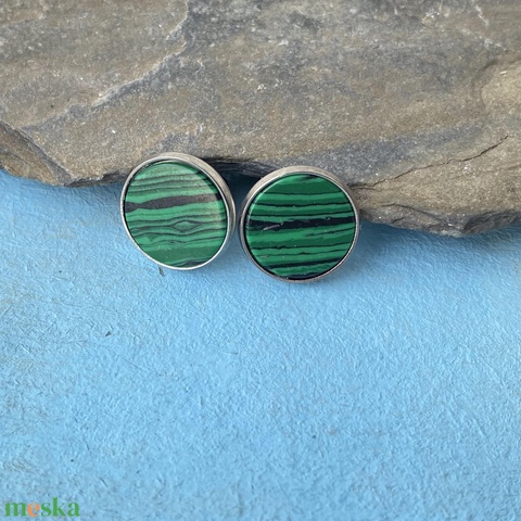 Zöld csíkos malachit fülbevaló - 12 mm-es bedugós ásvány fülbevaló nemesacél alapban