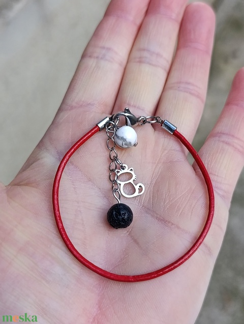 Piros hengerbőr kapcsos karkötő cica medállal, howlittal és lávakővel, aroma ékszer