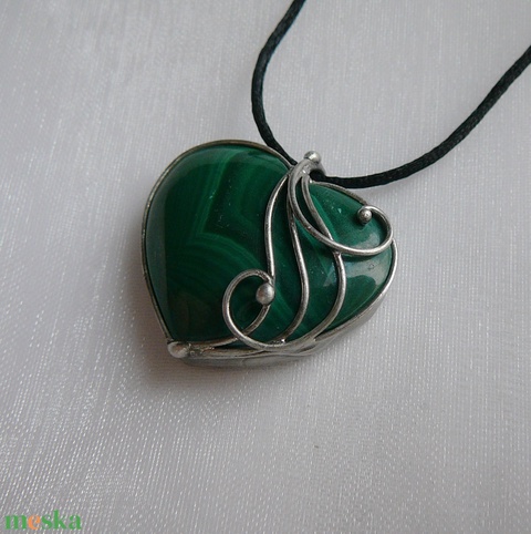 A medál tiffany technikával készült malachit és ólommentes, ezüsttartalmú ón felhasználásával. A díszítés szintén saját készítésű, nem tartalmaz gyári elemeket. A fémrészt óezüstre patináztam, lekezeltem antioxidánssal és lelakkoztam, hogy sokáig szép maradjon.
