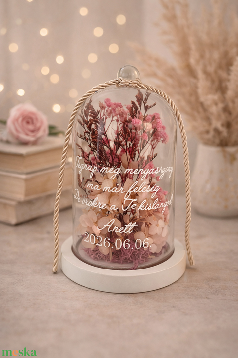 Virágbúra szárazvirággal, egyedi felirattal esküvői szülőköszöntő ajándék