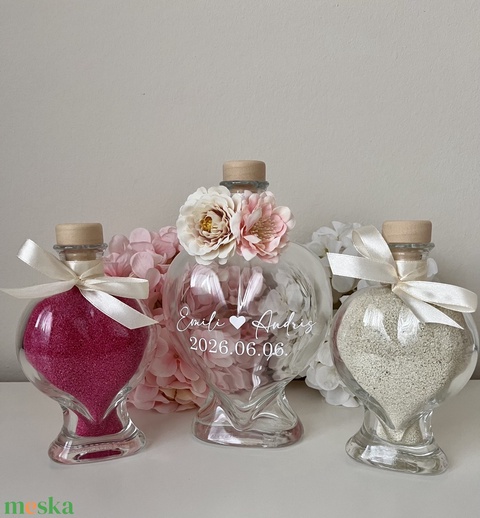 Homokceremónia üveg szett - kalligrafikus nevekkel - AJÁNDÉK felirattal, virágos díszítéssel