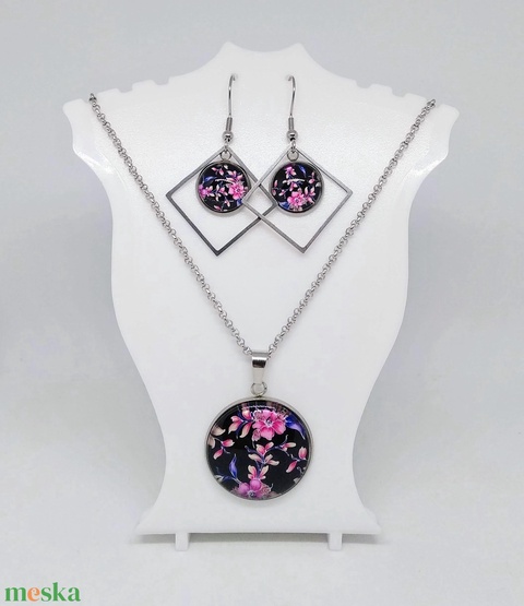 Pink virágos üveg cabochon nyaklánc-fülbevaló szett
