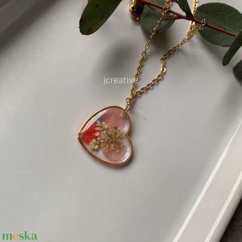 Préselt hortenzia, vadmurok szív formájú medálba