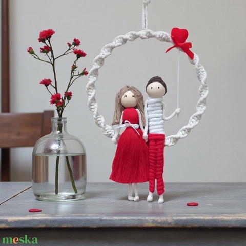 Valentin napi egyedi falidísz – Személyre szabható makramé szerelmespár piros szívvel