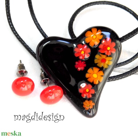 Fekete piros-sárga virágos szív üvegékszer szett, nyaklánc, pötty fülbevaló