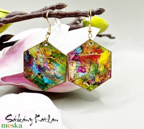 - Anyaga: fa fülbevaló alap, akrilfesték, alkoholos tinta