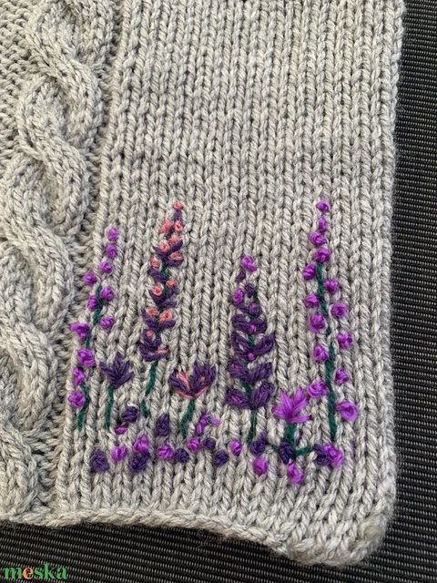 Kézi kötésű könyvborító csavart mintával és lila hímzett virágokkal díszítve eladó