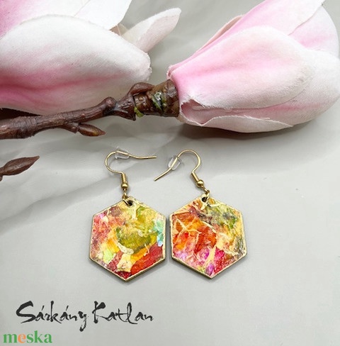 - Anyaga: fa fülbevaló alap, akrilfesték, alkoholos tinta