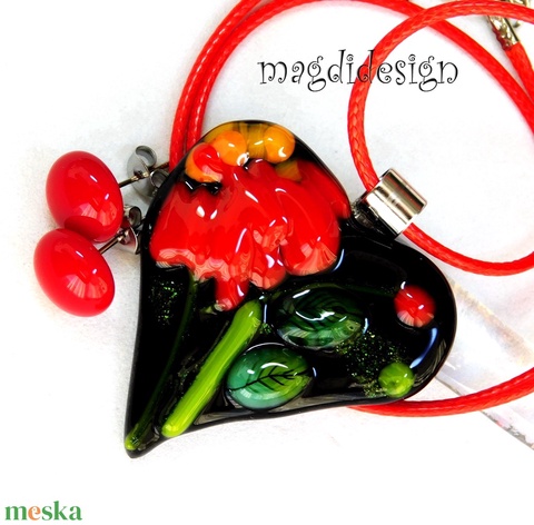 Fekete piros virágos szív üvegékszer szett, nyaklánc, pötty fülbevaló 2