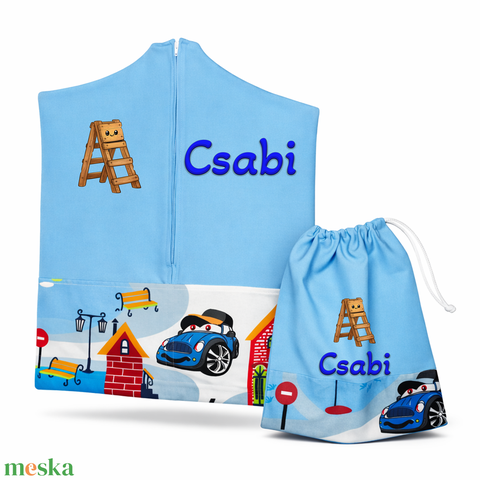Ovis zsák + tornazsák szett névvel és jellel (kék + autós-házikós), ajándék szeretetküldővel