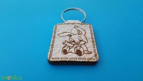 Húsvéti kulcstartó műbőr alappal, ülő, integető nyuszi mintával.