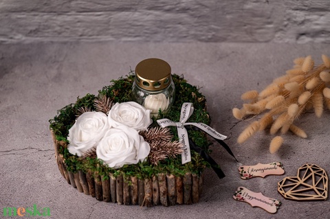 - Anyaga: szárított moha, üveg, gyertya, szalag, fa, selyemvirág