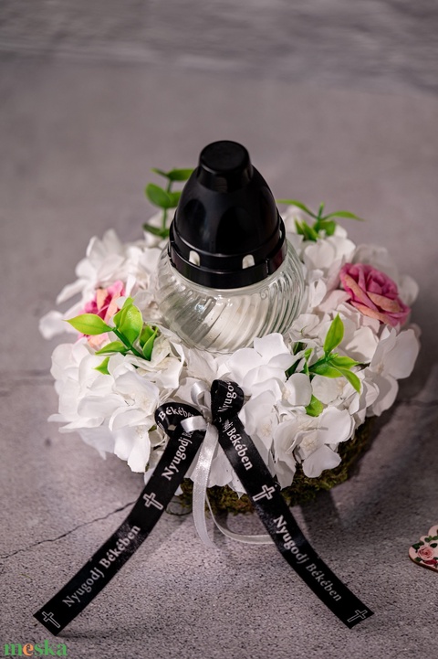 - Anyaga: mohakoszorú, üveg, gyertya, selyemvirág, szalag