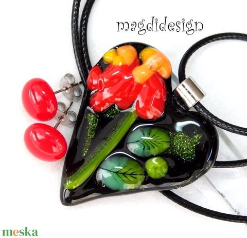Fekete piros virágos szív üvegékszer szett, nyaklánc, pötty fülbevaló 3