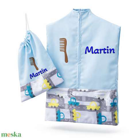 Ovis zsák + tornazsák szett névvel és jellel (kék + kék-sárga autós), ajándék szeretetküldővel