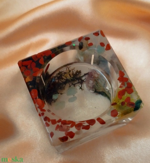 Két féle ásványt használtam a dekorációhoz.Vörös jáspist és zöld aventurint. Kiváló ajándék ötlet lehet barátoknak, kollégáknak, szeretteinknek. FIGYELEM! Kizárólag teamécsessel használható, gyertya égetése nem javasolt.