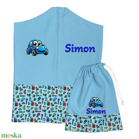 Ovis zsák + tornazsák szett névvel és jellel (kék + kisautós), ajándék szeretetküldővel
