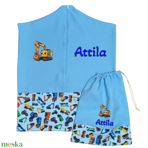 Ovis zsák + tornazsák szett névvel és jellel (kék + munkagépes), ajándék szeretetküldővel