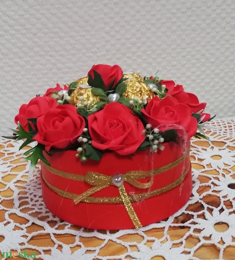 - Anyaga: papír doboz, tűzőhab, foamiran, mű zöldek és bogyók, ferrefo rocher bonbon