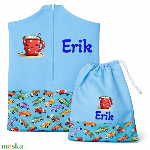 Ovis zsák + tornazsák szett névvel és jellel (kék + színes autós), ajándék szeretetküldővel
