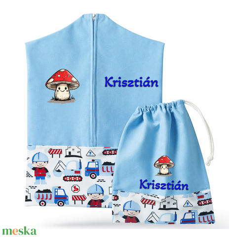 Ovis zsák + tornazsák szett névvel és jellel (kék + útépítős), ajándék szeretetküldővel