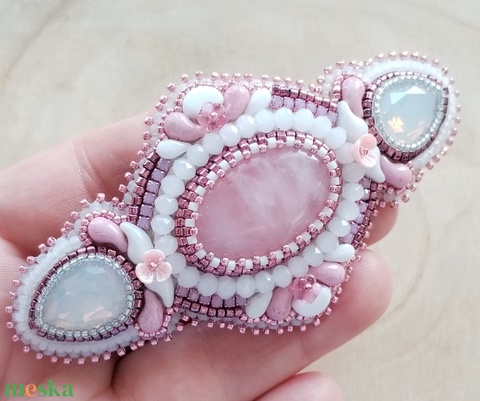 rózsakvarc, kristály csepp, szrasszlánc, virág gyöngy, csek két lyukú gyöngy, japán kásagyöngy, bőr, franciacsat alap