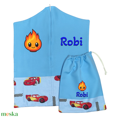 Ovis zsák + tornazsák szett névvel és jellel (kék + versenyautós), ajándék szeretetküldővel