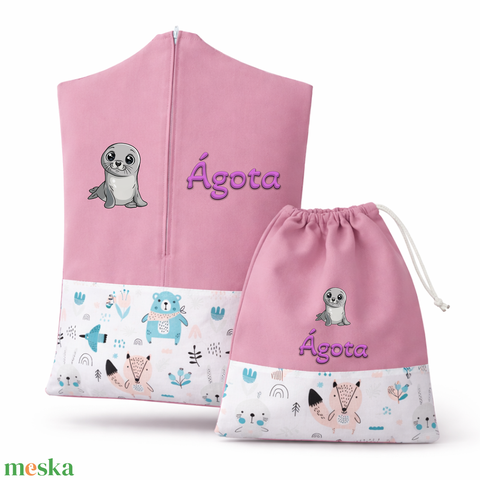 Ovis zsák + tornazsák szett névvel és jellel (rózsaszín + bébi állatkás), ajándék szeretetküldővel