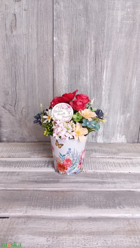 - Anyaga: művirágok, tűzőhab, műzöldek, bádogkaspó