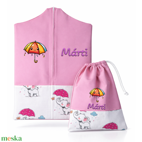 Ovis zsák + tornazsák szett névvel és jellel (rózsaszín + esernyős elefántos), ajándék szeretetküldővel