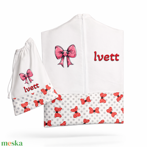 Ovis zsák + tornazsák szett névvel és jellel (fehér + piros-pöttyös masnis), ajándék szeretetküldővel