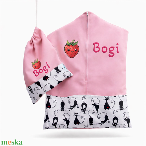 Ovis zsák + tornazsák szett névvel és jellel (rózsaszín + fekete cicás), ajándék szeretetküldővel
