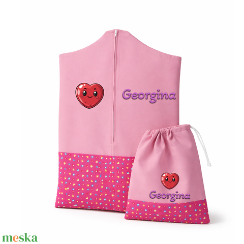 Ovis zsák + tornazsák szett névvel és jellel (rózsaszín + pink szívecskés), ajándék szeretetküldővel