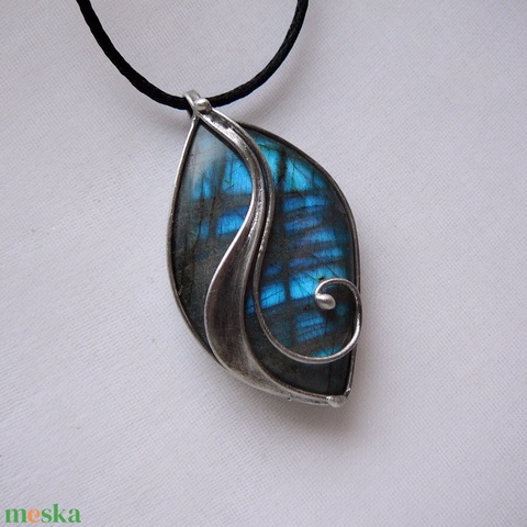 A medál Tiffany technikával készült labradorit és ólommentes, ezüsttartalmú ón felhasználásával. A díszítés szintén saját készítésű, nem tartalmaz gyári elemeket. A fémrészt óezüstre patináztam, lekezeltem antioxidánsal és lelakkoztam, hogy sokáig szép maradjon.