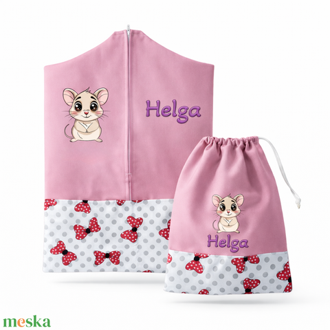 Ovis zsák + tornazsák szett névvel és jellel (rózsaszín + piros-pöttyös masnis), ajándék szeretetküldővel